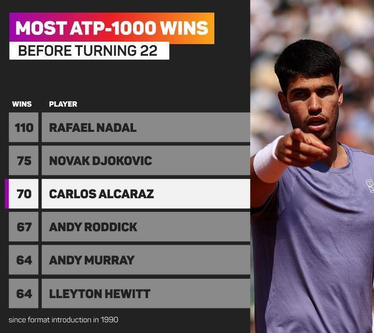 这场比赛是阿尔卡拉斯在大师赛的第70场胜利,他成为了纳达尔(110)和德约科维奇(70)之后,第3位22岁之前在大师赛取得70场胜利的球员。